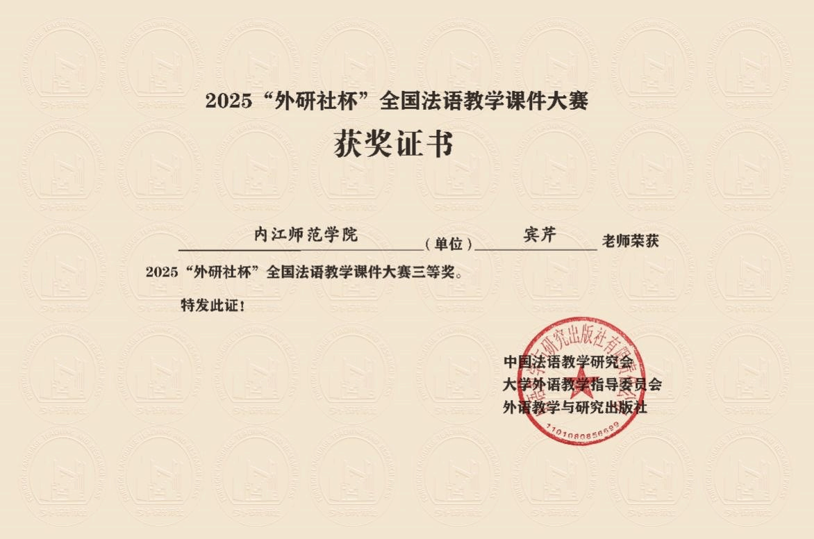 近日,从2025年“外研社杯”全国法语教学课件大赛组委会传来喜讯,我院宾芹老师凭借其精湛的课件设计与独特的教学理念,在全国高校众多参赛者中脱颖而出,荣获大赛三等奖。