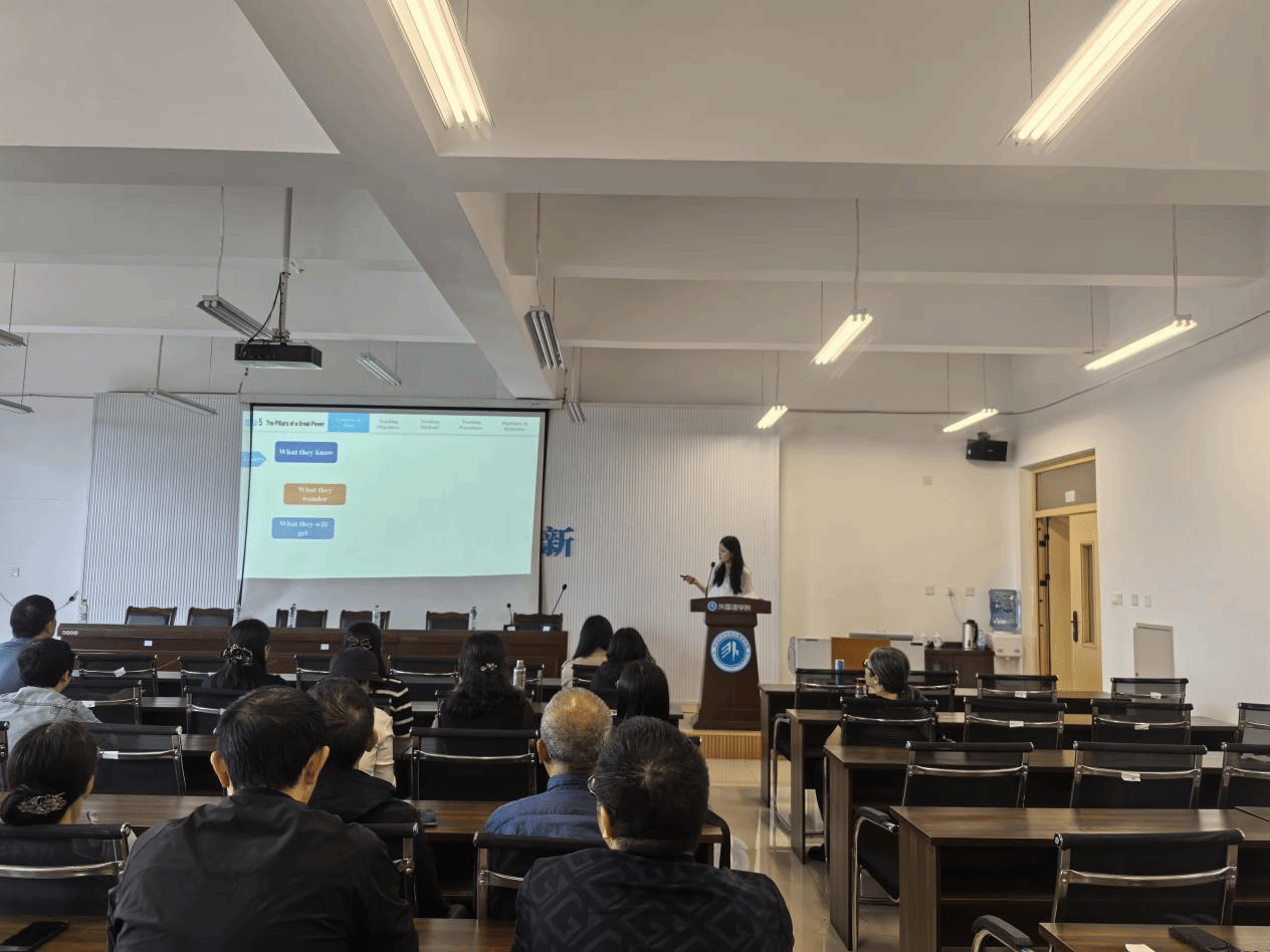 2025年9月22日下午,大学外语教研室以四川省“高教社杯”普通本科高校外语课程思政教学比赛为契机,组织开展了说课观摩教研活动。本次活动由教研室主任袁渊泉主持,特邀今年成功入围省赛的严婕和邓翕文两位教师进行说课展示,教研室全体教师参与观摩并进行深入交流与评议。
