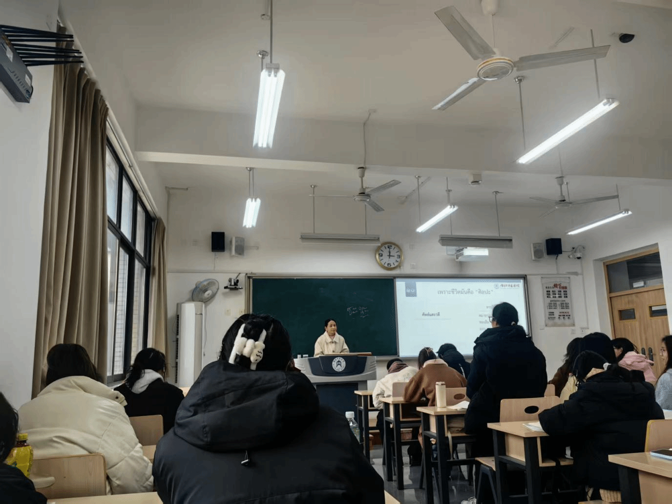 为构建高效课堂,推进课堂教学创新,提高泰语专任教师的专业教学水平,加强教师团队教学经验的交流互鉴,12月24日,泰语专业开展本学期公开课观摩课活动。本次公开课观摩课活动由泰语外籍教师金熙蕾(Suwan Laksarin)老师进行授课。泰语专业全体教师进行了交流学习。