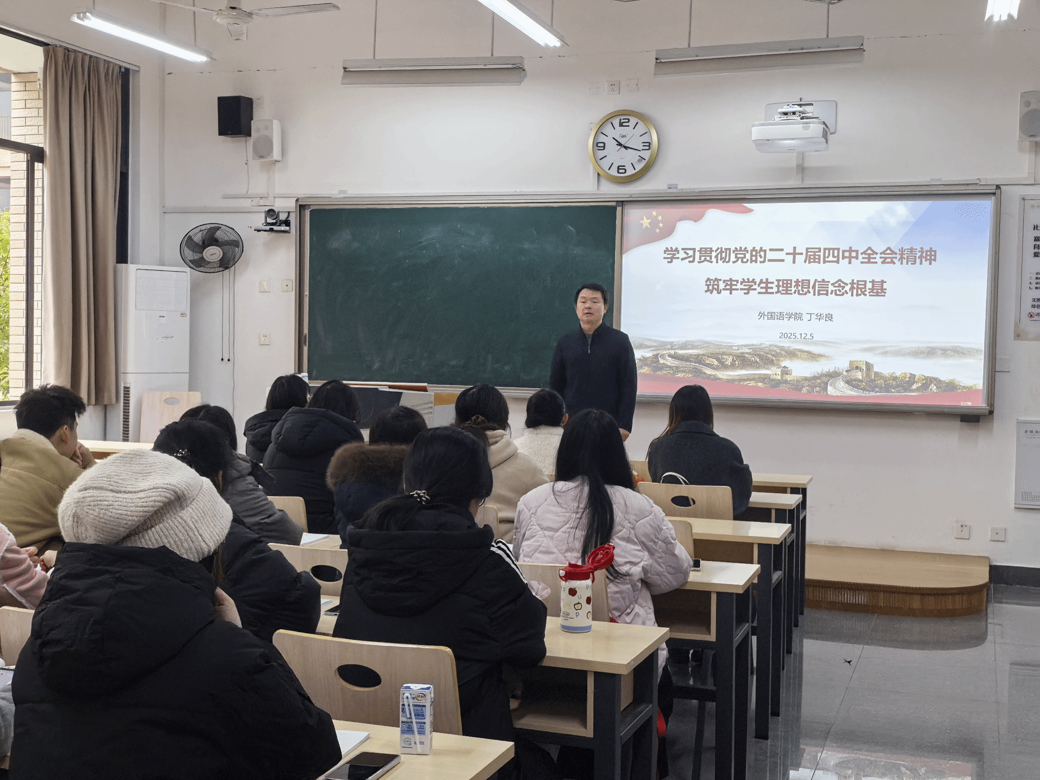 2025年12月5日,外国语学院副院长丁华良在明德楼B115教室,为联系班级—泰语专业24级1班全体学生作“学习贯彻党的二十届四中全会精神、筑牢学生理想信念根基”专题党课。本次党课以深度解读全会精神为核心,结合学科发展与成长规划,引导学子将个人理想融入时代发展大局,切实筑牢理想信念根基。
