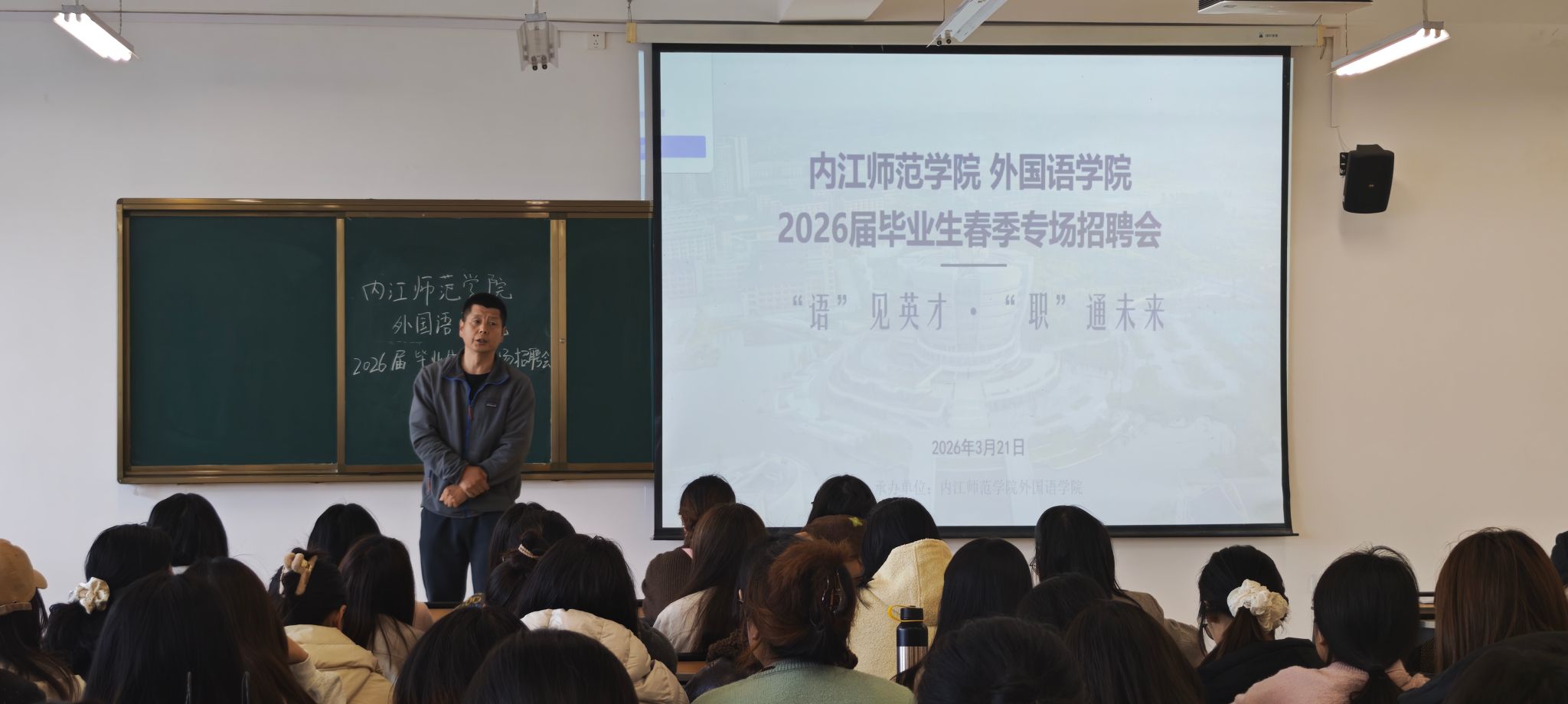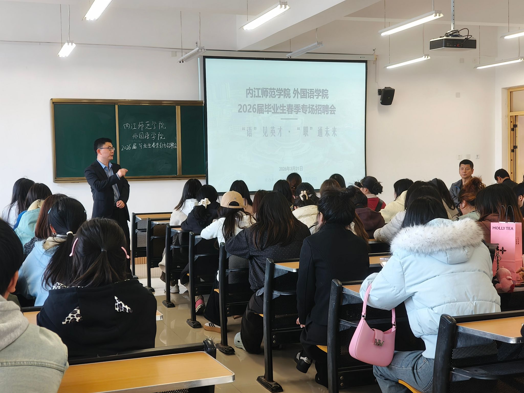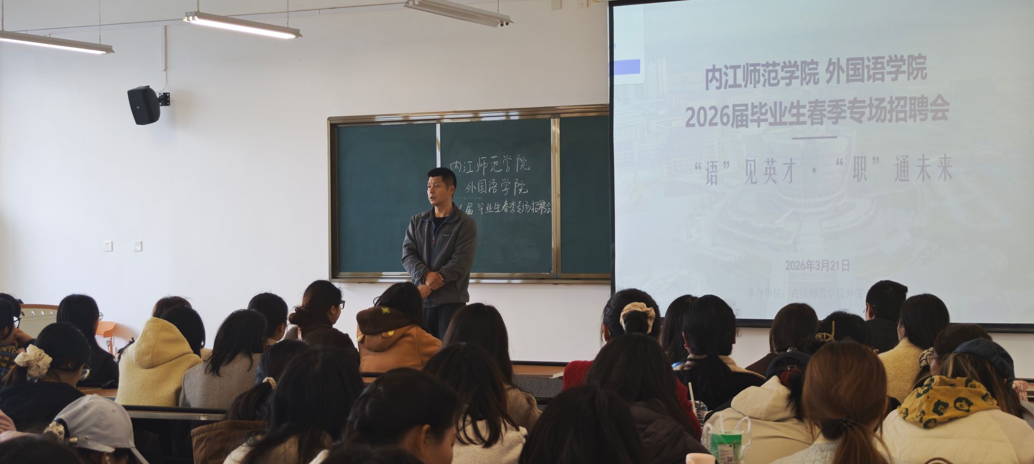 为切实助力2026届毕业生拓宽就业渠道,明确求职方向,缓解就业焦虑,2026年3月21日下午13:30,学院在弘文楼502教室召开2026年春季专场招聘会动员大会。学院党委书记陈敏、副院长(主持工作)解超群、党委副书记蒋明芳、学工办主任曾乾辉、翻译教研室主任肖强、学工办何珊共同为毕业生求职之路赋能蓄力,2022级全体毕业生参会,