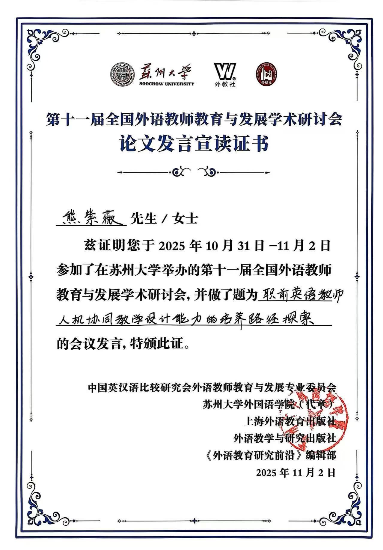 2025年11月1日至2日,由中国英汉语比较研究会外语教师教育与发展专业委员会主办、苏州大学外国语学院和上海外语教育出版社共同承办、外语教学与研究出版社和《外语教育前沿研究》编辑部协办的“第十一届全国外语教师教育与发展学术研讨会”在苏州大学顺利召开。我院教师熊紫薇在会上围绕议题“数智时代外语教师素养”做了题为“职前英语教师人机协同教学设计能力的培养路径探索”的会议发言。
