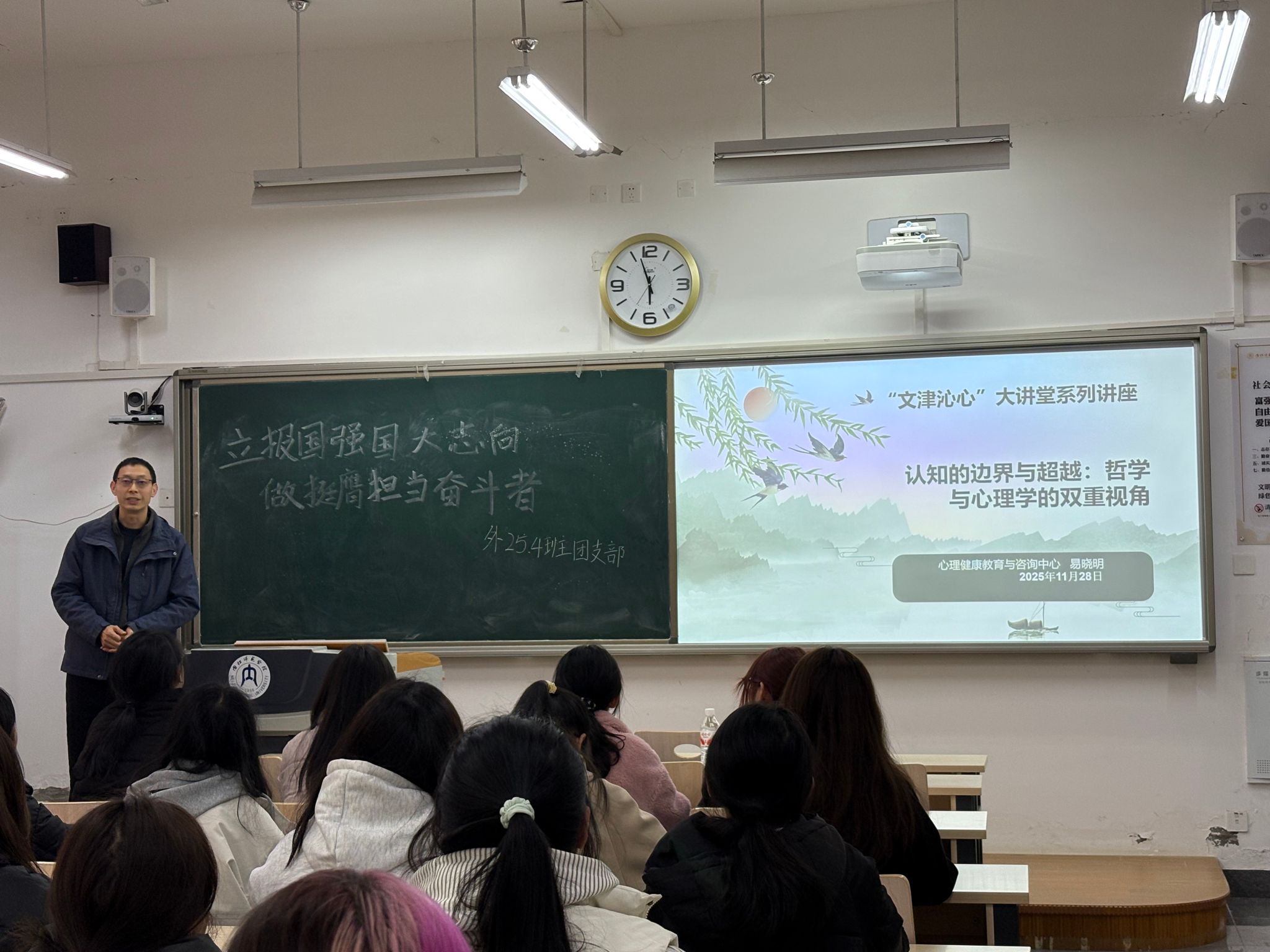 2025年11月28日,合作交流处处长赵军走进联系班级外25.4班,在明德楼B113教室举办专题讲座,特邀大学生心理健康教育与咨询中心主任易晓明主讲“认知的边界与超越:哲学与心理学的双重视角”。